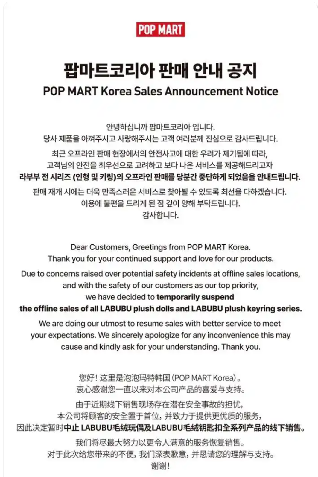 6月14日,泡泡玛特韩国发布公告称,由于近期线下销售现场存在潜在安全事故的担忧,决定暂时中止LABUBU毛绒玩偶及LABUBU毛绒钥匙扣全系列产品的线下销售。公司将尽最大努力以更令人满意的服务恢复销售。