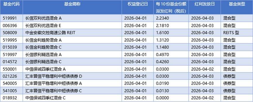 (1)04月01日新发基金共有35只,主要为混合型基金和债券型基金,其中景顺长城中证全指证券公司ETF募集目标金额达80.00亿元;基金分红12只,多为混合型,派发红利最多的基金是长信双利优选混合型证券投资基金,每10份基金份额派发红利2.2340元。