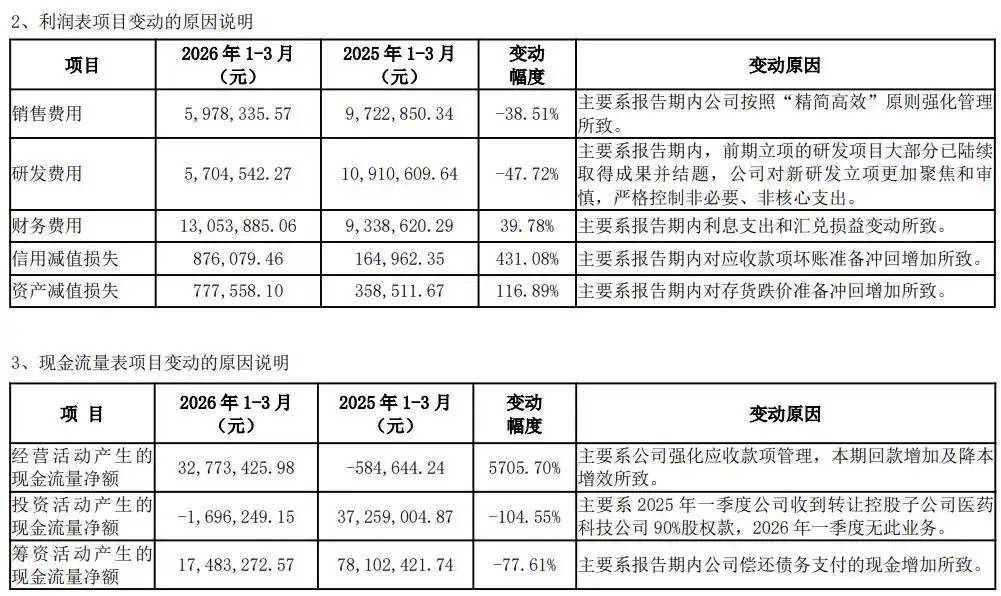 广济药业2026年一季报主要会计数据一季报显示,公司首季财务费用增加39.78%,主要系报告期内利息支出和汇兑损益变动所致,但同期销售费用减少38.51%,研发费用减少47.72%。