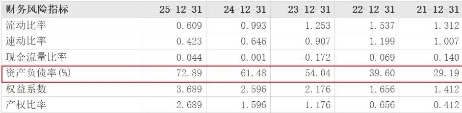 另外,值得注意的是,东方财富网财务风险指标显示,广济药业2025年资产负债率为72.89%,已经是连续4年持续攀升。