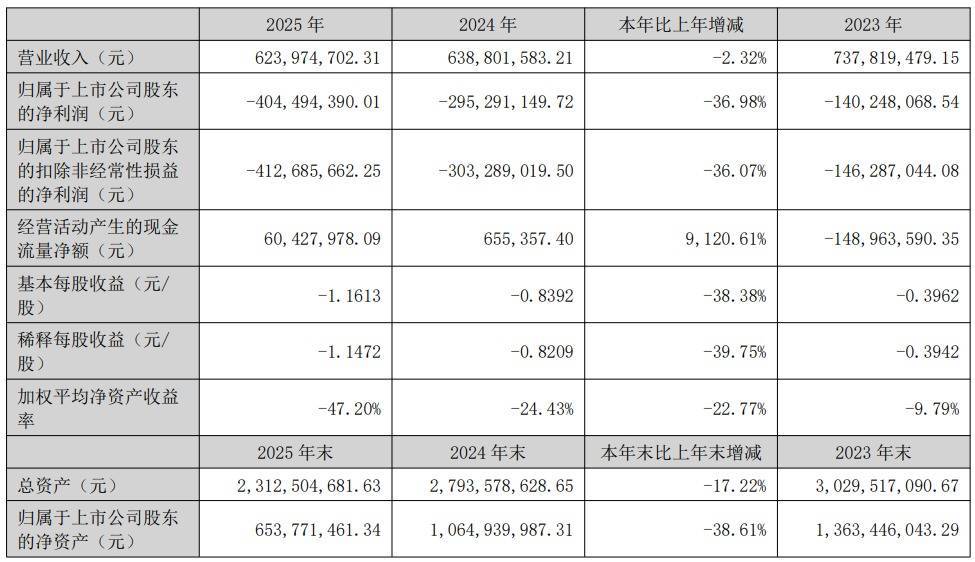 广济药业2025年年报显示,公司报告期营业收入为6.24亿元,同比下降2.32%;归母净利润自上年同期亏损2.95亿元变为亏损4.04亿元,亏损额进一步扩大;扣非归母净利润自去年同期亏损3.03亿元变为亏损4.13亿元,亏损额进一步扩大。