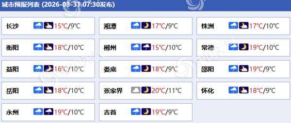 r具体来看,湖南省气象台预计,今天,全省阴天有小到中等阵雨或雷阵雨转阴天,其中永州南部、郴州南部局地大雨,并伴有雷暴大风等强对流天气,雷雨时局地阵风6至8级。各地最高气温16至20℃,最低气温8至13℃。
